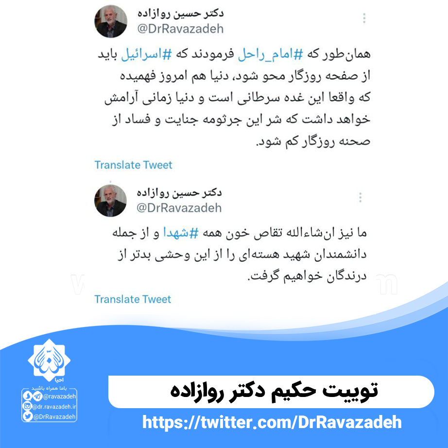 توییت دکتر روازاده در مورد فرمایش امام راحل درباره اسرائیل
