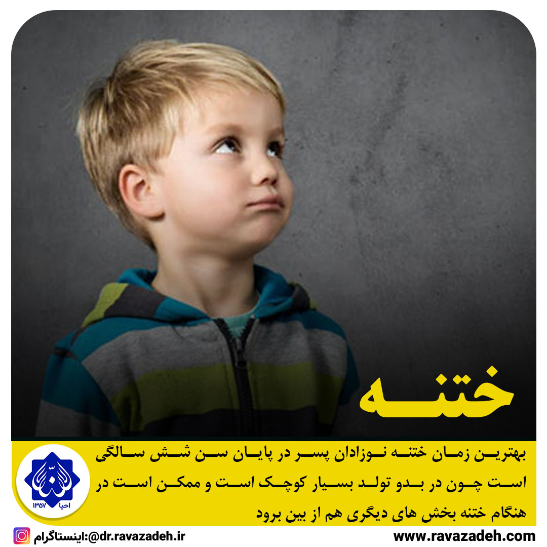 بهترین زمان ختنه نوزادان پسر در پایان سن شش سالگی است چون در بدو تولد بسیار کوچک است و ممکن است در هنگام ختنه بخش های دیگری هم از بین برود .