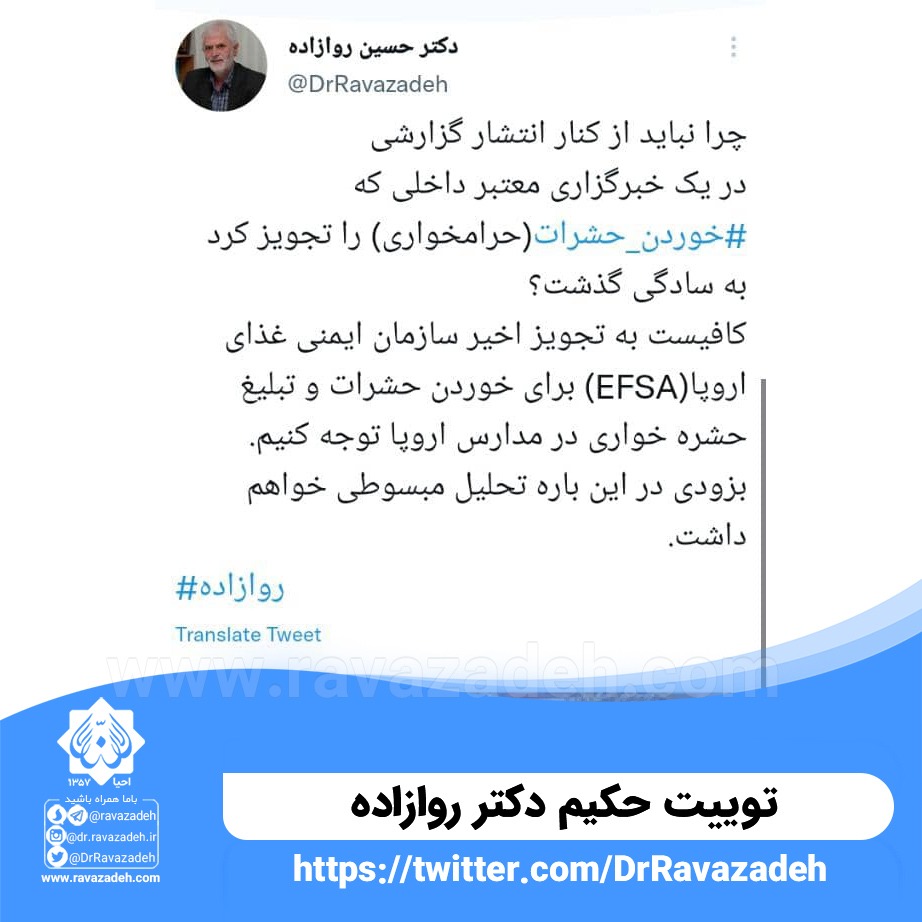 توییت حکیم دکتر روازاده درباره پشت پرده تبلیغ حشره خواری «چرا نباید از کنار انتشار گزارشی در یک خبرگزاری معتبر داخلی که خوردن حشرات(حرامخواری) را تجویز کرد به سادگی گذشت؟