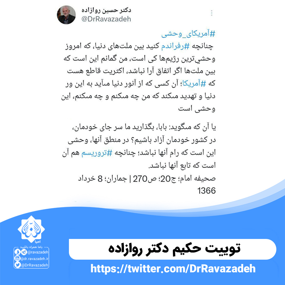 توییت حکیم دکتر روازاده : چنانچه #رفراندم كنيد بين ملتهاى دنيا، كه امروز وحشيترين رژيمها كى است، من گمانم اين است كه بين ملتها اگر اتفاق آرا نباشد، اكثريت قاطع هست كه #آمریکا؛ آن كسى كه از آنور دنيا مىآيد به اين ور دنيا و تهديد مىكند كه من چه مىكنم و چه مىكنم، اين وحشى است يا آن كه مىگويد: بابا، بگذاريد ما سر جاى خودمان، در كشور خودمان آزاد باشيم؟ در منطق آنها، وحشى اين است كه رام آنها نباشد؛ چنانچه #تروريسم هم آن است كه تابع آنها نباشد.