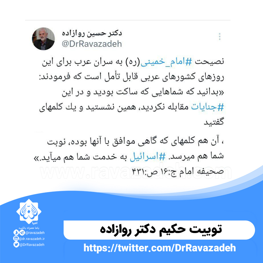 توییت حکیم دکتر روازاده:نصیحت #امام_خمینی(ره) به سران عرب برای این روزهای کشورهای عربی قابل تأمل است که فرمودند: «بدانید كه شماهایی كه ساكت بودید و در این #جنایات مقابله نكردید، همین نشستید و یك كلمهای گفتید، آن هم كلمهای كه گاهی موافق با آنها بوده، نوبت شما هم میرسد. #اسرائیل به خدمت شما هم میآید.» صحیفه امام ج:۱۶ ص:۴۳۱