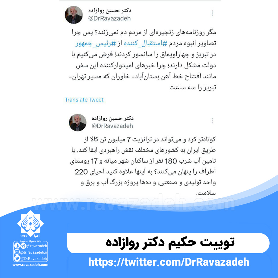 توییت حکیم دکتر روازاده : مگر روزنامههای زنجیرهای از مردم دم نمیزنند؟ پس چرا تصاویر انبوه مردم استقبالکننده از رئیسجمهور در تبریز و چهاراویماق را سانسور کردند! فرض میکنیم با دولت مشکل دارند؛ چرا خبرهای امیدوارکننده این سفر، مانند افتتاح خط آهن بستانآباد- خاوران که مسیر تهران- تبریز را سه ساعت کوتاهتر کرد و میتواند در ترانزیت 7 میلیون تن کالا از طریق ایران به کشورهای مختلف نقش راهبردی ایفا کند، یا تامین آب شرب 180 نفر از ساکنان شهر میانه و 17 روستای اطراف را پنهان میکنند؟ به اینها علاوه کنید احیای 220 واحد تولیدی و صنعتی، و دهها پروژه بزرگ آب و برق و سلامت.