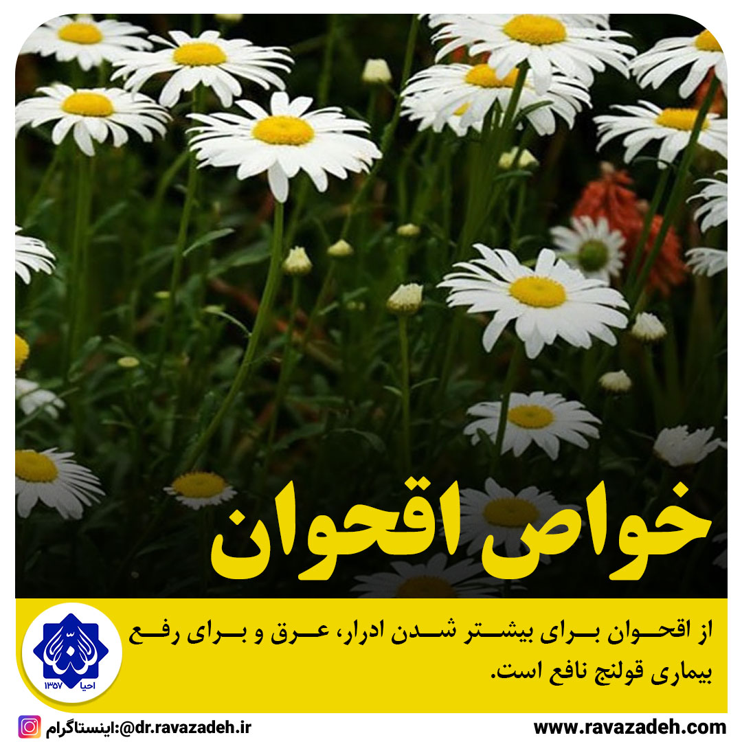 پخته شده آن در آب و نوشیدن آب آن همراه با آب و عسل ادرارآور بسیار قوی است و تحلیل برنده خون مردگیها در معده و مثانه است و تسکین بخش درد مثانه و معده است و اگر آب آن را همراه با گل آن با هم بخورند برای ریختن سنگهای کلیه و مثانه و گشودگی و برطرف کردن قولنج پرفایده است. و آبی که شکوفه اقحوان در آن پخته است، ادرارآور است و البته بازگشاینده خون حیض هم هست و حمول آن یعنی دربرگرفتن و استعمال آن برای بانوان برای جاری شدن خون حیض بسیار سودمند است و تحلیل برنده سفت و سخت شدن رحم و بازگشاینده گرفتگیهای آن و رفع بواسیر و دهانهها و تکمههای بواسیر است. و نشستن در آب آن جاری کننده خون حیض و پاک کننده رحم است و جهت رفع سفت و سخت شدن رحم مناسب است. طلا کردن آب آن بر روی بیضههای آقایان و اندام تناسلی آنها و کنارههای رانها برای تقویت قوای جنسی مناسب است. و اگر از آن ضمادی (پماد و روغنی) بسازند و بر روی پارچهای بمالند و بر روی اندام بگذارند برای رفع درهم پیچیده شدن اعصاب و نیز دفع زهر جانوران گزنده و سمی مفید است و اگر همراه با موم و روغن بر روی دوساق پا بگذارند سختی و تورم ساقهای پا و یا اندامهای دیگر را از بین میبرد.