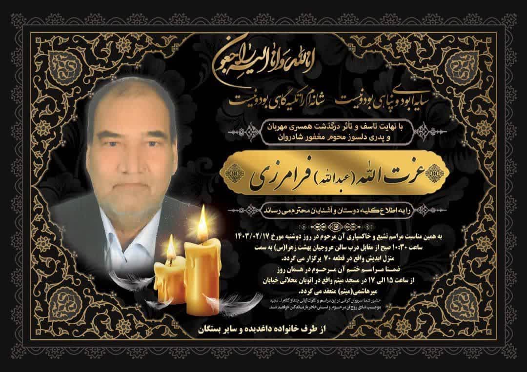 بدینوسیله درگذشت جناب آقای عزت الله فرامرزی، پدر بزرگوار همسر آقای علیرضا قیاسی را از صمیم قلب تسلیت عرض نموده و از خداوند منان طلب مغفرت برای آن مرحوم و صبر برای بازماندگان را مسئلت می نماییم.