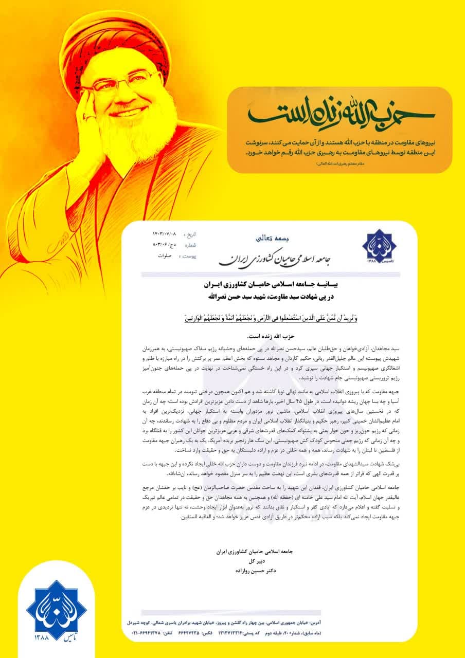 بیـانیـه جـامعه اسـلامی حامیـان کشاورزی ایـران در پی شهادت سید مقاومت، شهید سید حسن نصرالله